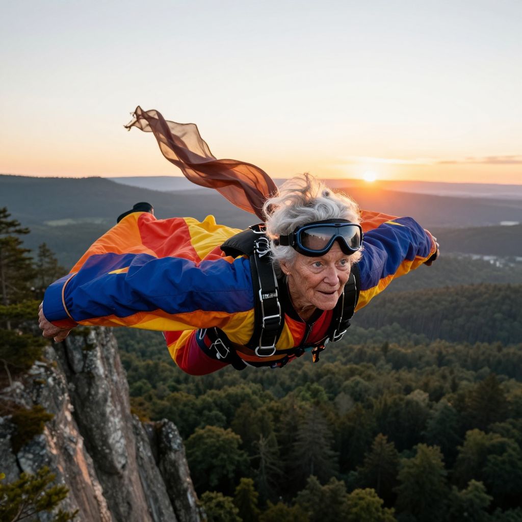 Extreme granny performing a daring base jump off a cliff, wearing colorful wingsuit and goggles, breathtaking aerial perspective over vast forest landscape with sunrise in background, sharp focus on her fearless look and flowing scarf.