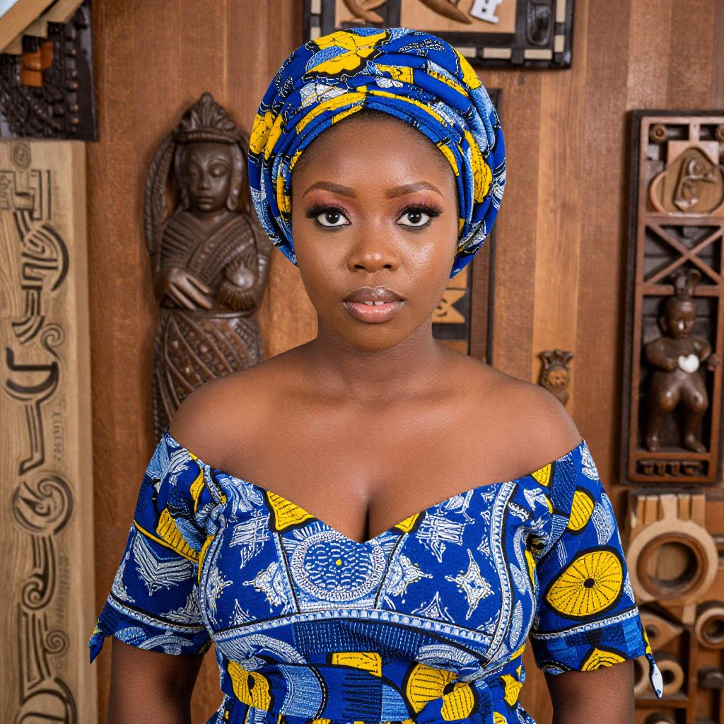 Photograph of a dark-skinned African woman with a radiant smile, wearing an off-the-shoulder, blue and yellow patterned dress and matching headwrap. Her dress features white abstract designs and her headwrap has a vibrant lemon pattern. She has smooth, glowing skin and is standing in front of a wooden wall adorned with carved statues and intricate patterns. The background includes a statue of a figure with a headdress to her left and a rectangular wooden carving to her right. The image has a rich, warm color palette and a sharp, high-contrast style.