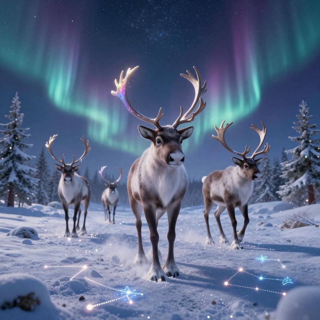 Snowstyle, ethereal fantasy concept art of {(Aurora reindeer, adorned with radiant antlers, traversed the polar sky, leaving behind streaks of colorful light. Their hoofprints in the snow formed constellations, illuminating a celestial path for a festive Christmas journey:1.4), centered, symmetrical, in the style of disney, Detailed digital art by greg rutkowski and Thomas kinkade, Trending on Artstation, CGSociety, deviantart, 8k, HD, detailed, high resolution, cinematic, unreal engine 5, 4k UHD image, octane render, epic angle and pose, 3d, depth of field, captivating patterns, creative experimentation, luminous magic trails, global illumination, cinematic light, epic shot, festive hues with diffused lighting, award-winning, professional, masterpiece, full sharp, UHD, HDR, 8k} . magnificent, celestial, ethereal, painterly, epic, majestic, magical, fantasy art, cover art, dreamy