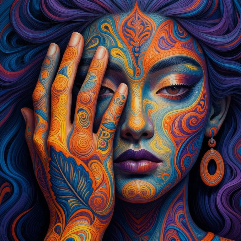 The image presents a highly detailed and vibrant portrait, featuring intricate patterns and textures that cover the entire visible surface. The hand, adorned with swirling, spiral designs and a prominent leaf-like motif, is positioned in the foreground, while the face in the background is similarly embellished with elaborate, organic patterns. The rich, deep colors range from cool blues and purples to warm oranges and yellows, creating a striking contrast that enhances the depth and dimensionality of the artwork. The composition is masterfully crafted, with the hand and face aligned in a balanced, symmetrical manner, drawing the viewer's eye across the entire image. The high level of detail, from the fine lines of the patterns to the subtle shading and highlights, gives the artwork a hyper-realistic quality, reminiscent of the works of artists like Alex Grey and Katsuhiro Otomo. The overall effect is both captivating and mesmerizing, with the interplay of colors, textures, and shapes creating a sense of depth and movement that is both visually stunning and artistically profound.
