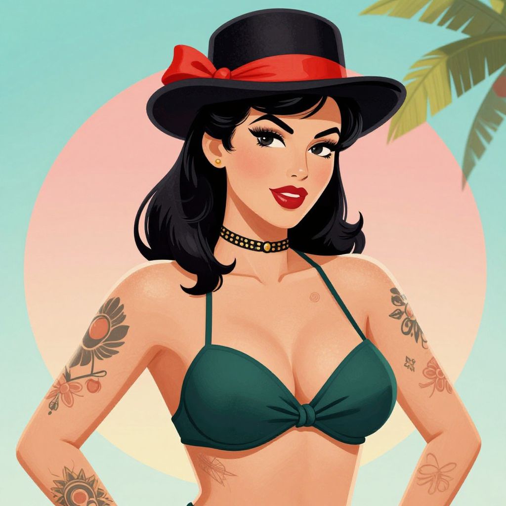 A vibrant pin-up illustration featuring a woman adorned with tattoos, wearing a stylish black hat with a red ribbon, a dark green bikini top, and a choker necklace, rendered in a retro, high-definition digital art style.