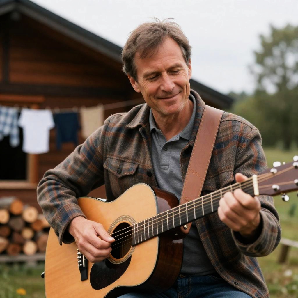Middle-Aged Man Singing and Playing Electric Guitar on Stage