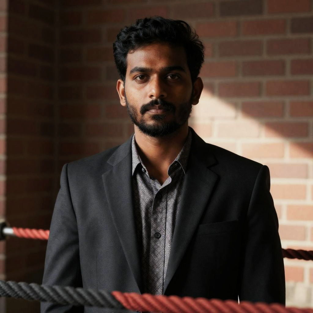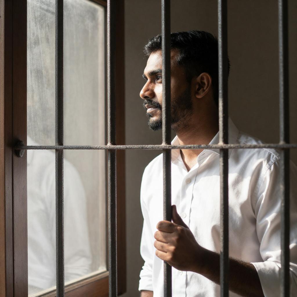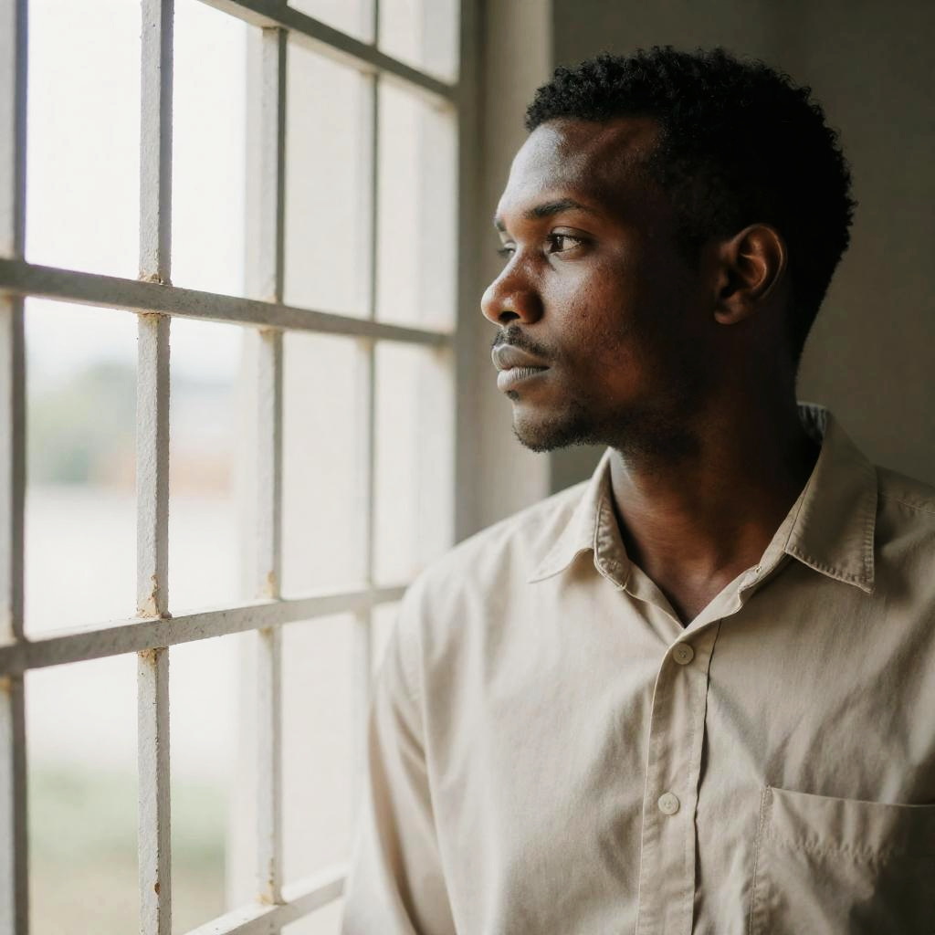 Portrait of a man with dark skin, short black hair, and a beard wearing a white shirt. He is standing indoors behind metal bars, looking intently out of a window with frosted glass and a wooden frame. Sunlight softly illuminates his face and hand gripping the bars.