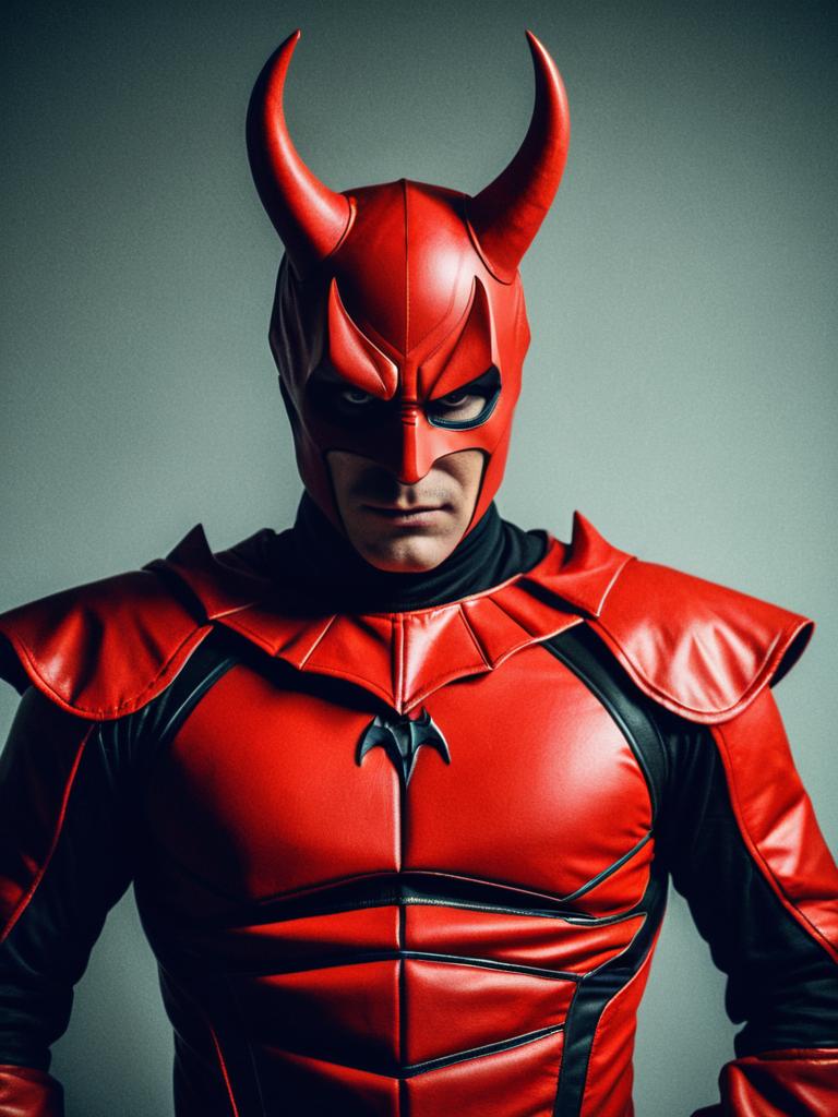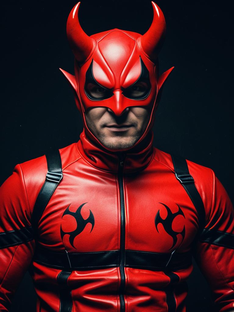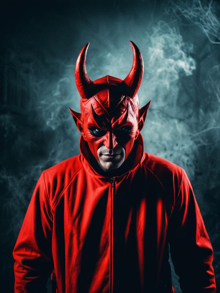 Man in Red Devil Costume, photorealistic Halloween cosplay portrait, cinematic realism