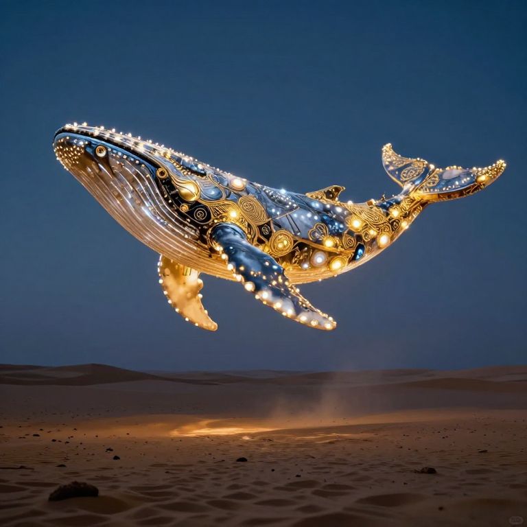 A luminous, mechanical whale adorned with intricate golden patterns and glowing orbs defies gravity as it gracefully hovers above a desolate desert landscape, its ethereal presence contrasting sharply with the barren terrain below.