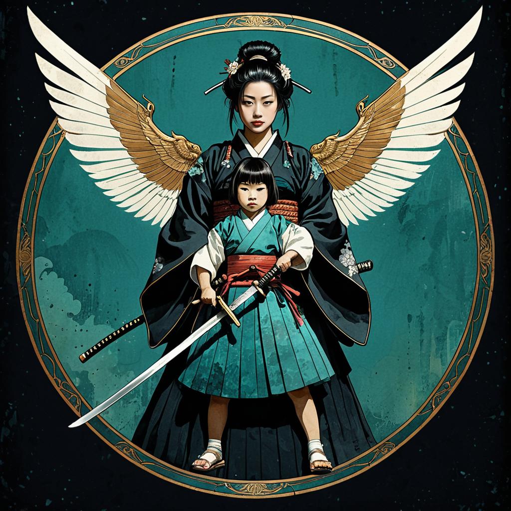 Retro Hairstyles full body Japanese woman samurai, katana unsheated, protecting a child hiding behind her. She is wearing a full plate, but the upper part of it is missing. Dark solid background, wings of light from the woman. Style is watercolor. Intricate art nouveau frame. Color scheme is primarily black and teal. ar 4:3,