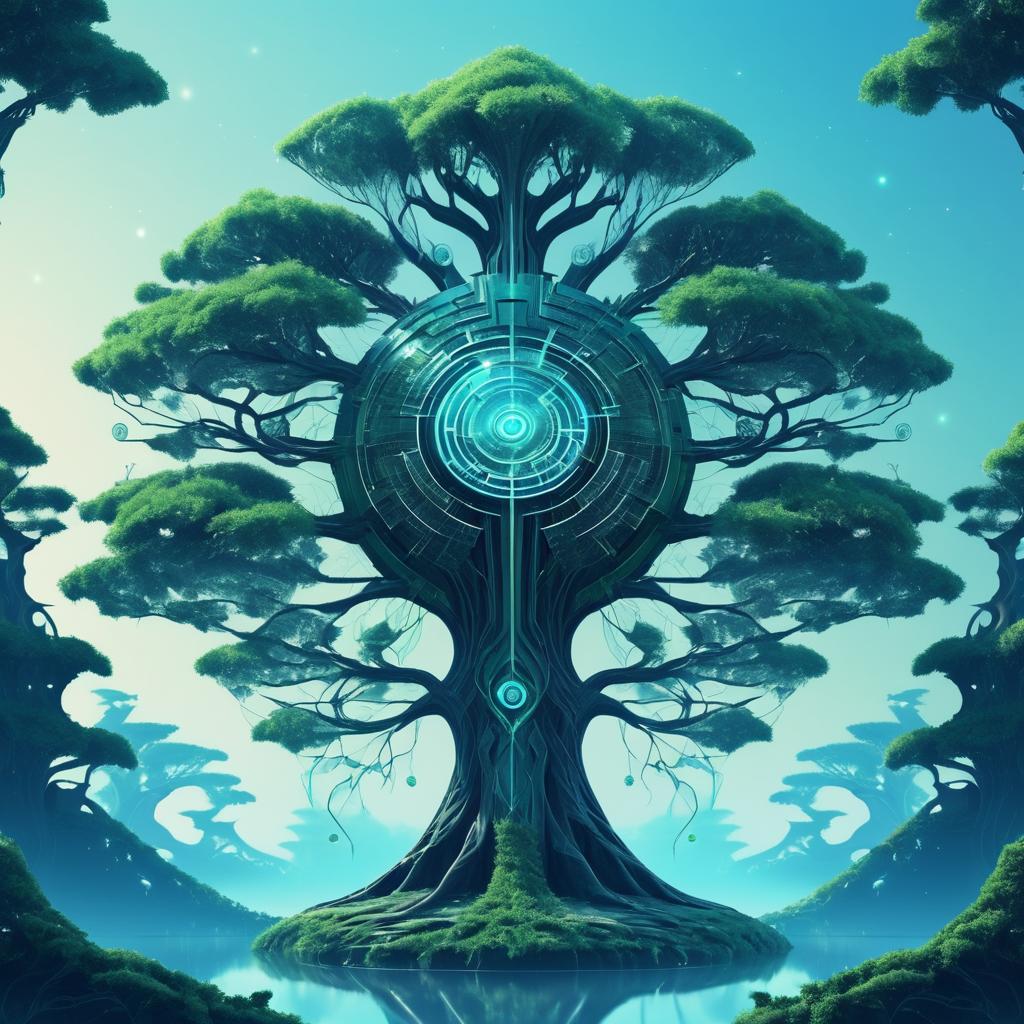 A surreal fantasy illustration of a large cybernetic tree featuring futuristic glowing circular patterns integrated into its trunk. The tree has lush green foliage and an otherworldly appearance, set against a calm blue sky and reflective water surface with other similar trees in the background.