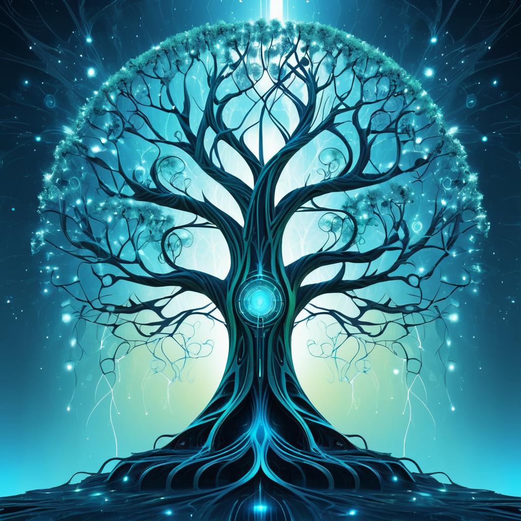 A cybernetic tree, fantasy illustration with a surreal and futuristic design.