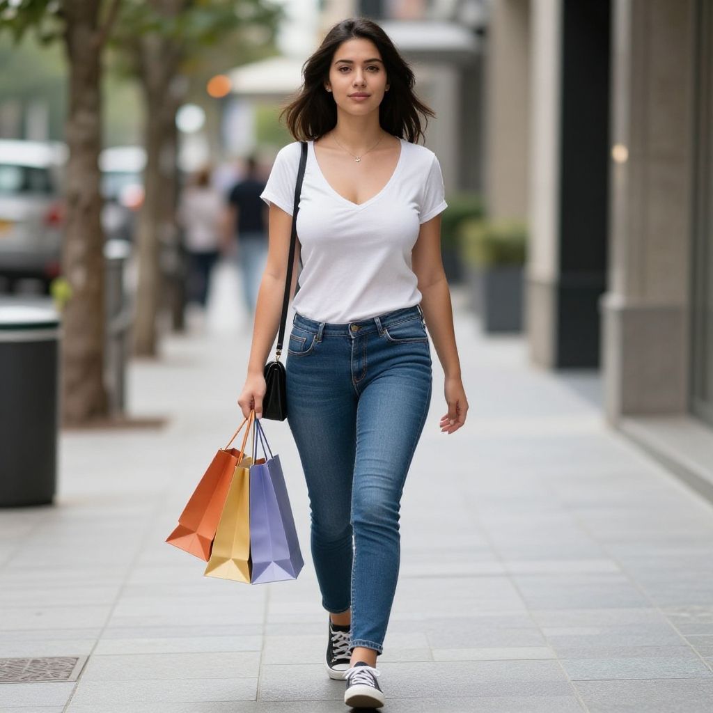 OverallDetail, (masterpiece, best quality, hires, high resolution:1.2, 4k, 8k, high quality), extremely detailed, realistic, intricate details, highres, 1girl, solo, young Hispanic woman, full body photo, perfect face (good mood, seductive mood), perfect body, athletic body, fit body, large breasts, (natural lighting), walking on a city sidewalk, summer, looking at viewer, from the front, long hair, brunette hair, ((short sleeves, v-neck baggy loose T-shirt)), jeans, sneakers, purse on shoulder, carrying shopping bags