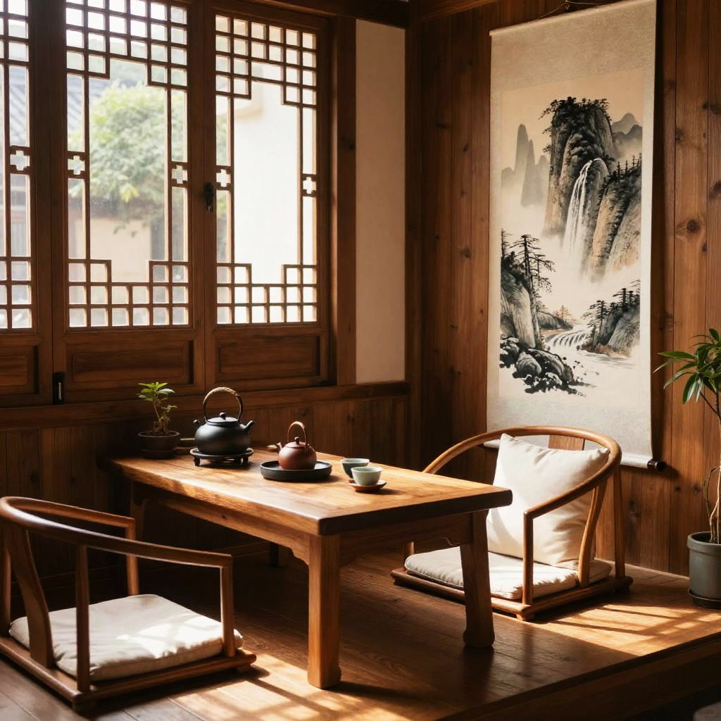 A warm and inviting traditional Asian interior featuring wooden lattice windows allowing natural light to stream in. The wooden table is set for tea with teapots and cups, accompanied by elegant wooden chairs with soft cushions. The room includes dark wood-paneled walls adorned with a tall scroll painting showcasing misty mountains and waterfalls in classic ink style. Subtle indoor plants and rustic wooden flooring enhance the calm and peaceful ambiance of the space.