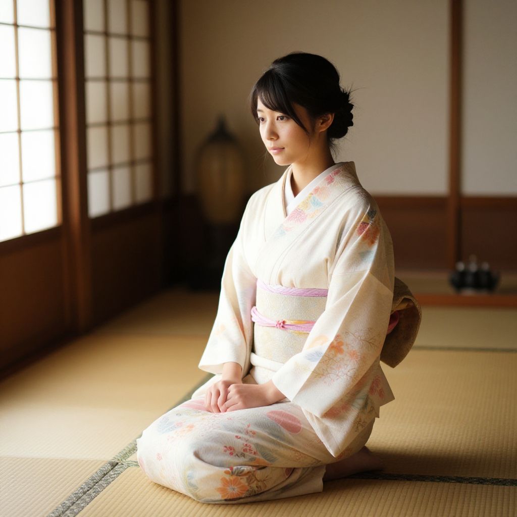 Photograph of a Japanese woman in a white kimono with blue and red floral patterns, standing in a traditional shoji-screen room, lit by a