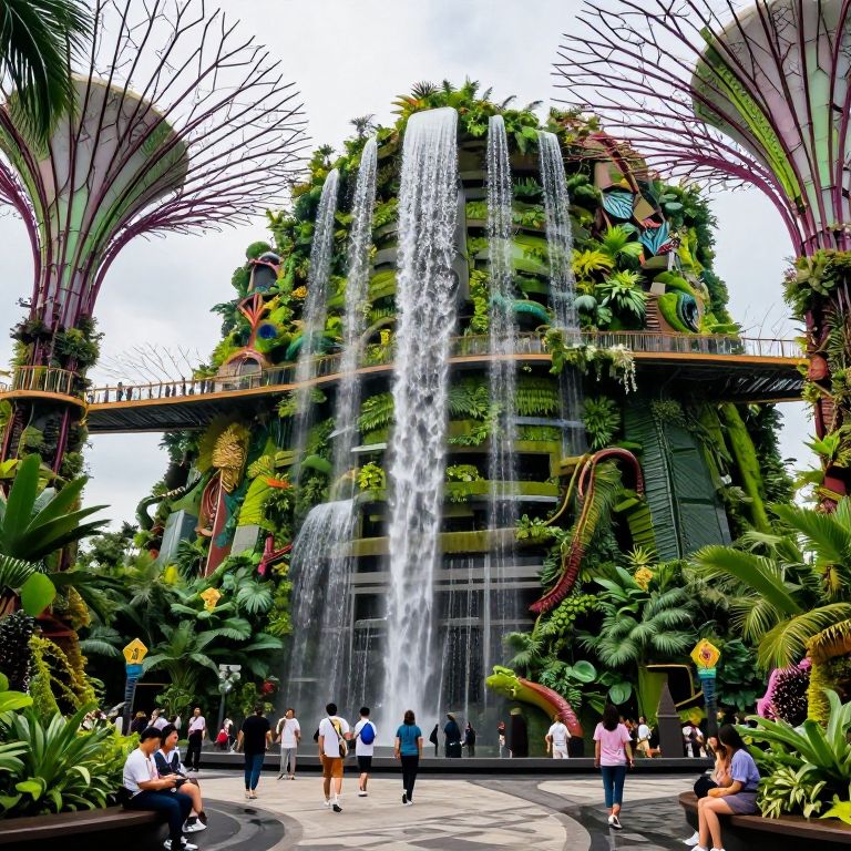 Photograph of a vibrant, tropical-themed indoor waterfall at a modern atrium, with people walking below, surrounded by lush greenery and towering palm-like