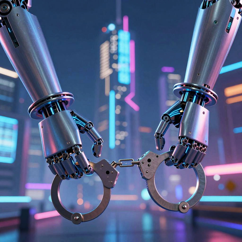 Handcuffing depicted in a futuristic setting, robotic hands applying sleek metallic cuffs with glowing blue circuits, sci-fi background with neon cityscape, high-tech security theme, ultra-detailed and vibrant colors