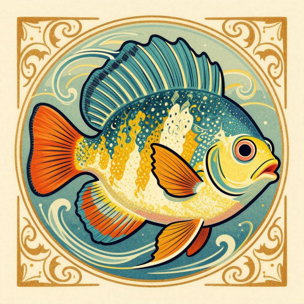 Vintage fish illustration showing a retro styled tropical fish with exaggerated fins and vibrant colors, bold outlines, Art Nouveau influence with swirling water patterns, elegant and decorative, warm toned background, whimsical and nostalgic aesthetic