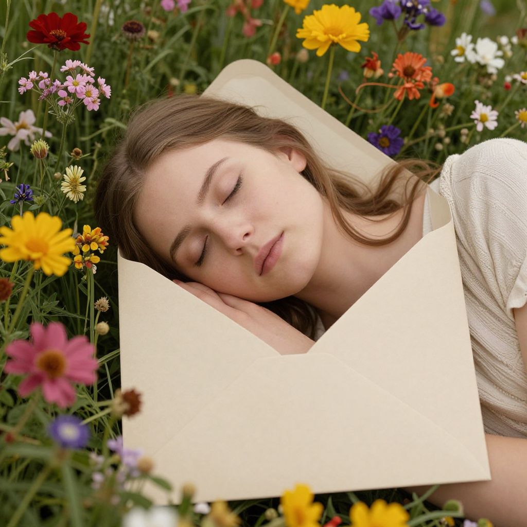 Photograph of a young Caucasian woman with fair skin and brown hair, sleeping peacefully in a vibrant garden filled with colorful flowers, including yellow, red, purple, and white blooms. She rests her head on a cream-colored paper, which partially obscures her face. Her eyes are closed, and she wears a white, slightly textured blouse. The background showcases a lush, green setting with various flowers in full bloom. The image has a serene, dreamy quality, emphasizing natural beauty and tranquility.