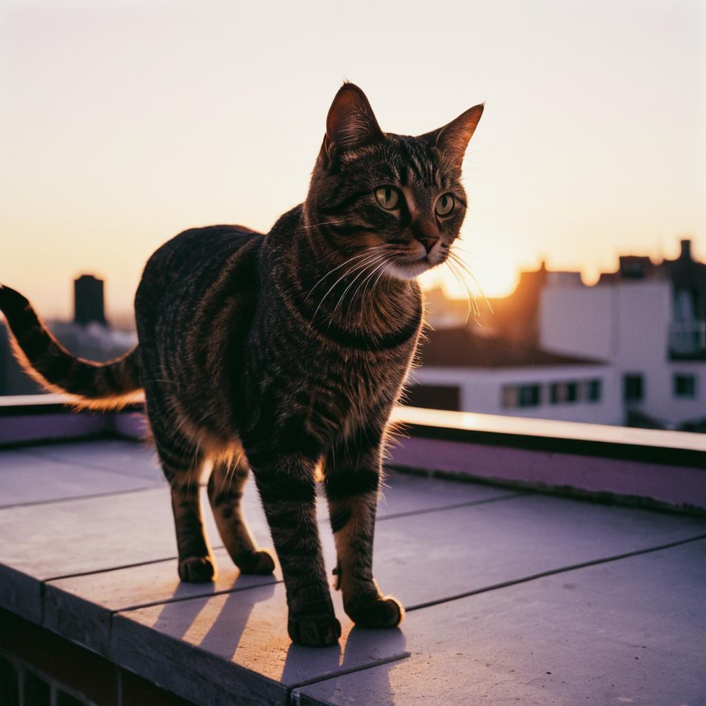 An adult tabby cat with distinctive dark spots and white paws standing on a steel gray rooftop terrace with burnt orange accents. The background features an urban cityscape with high-rise buildings under soft evening light. The photo captures intricate details and a subtle fawncore aesthetic, inspired by Edward Hopper's style.