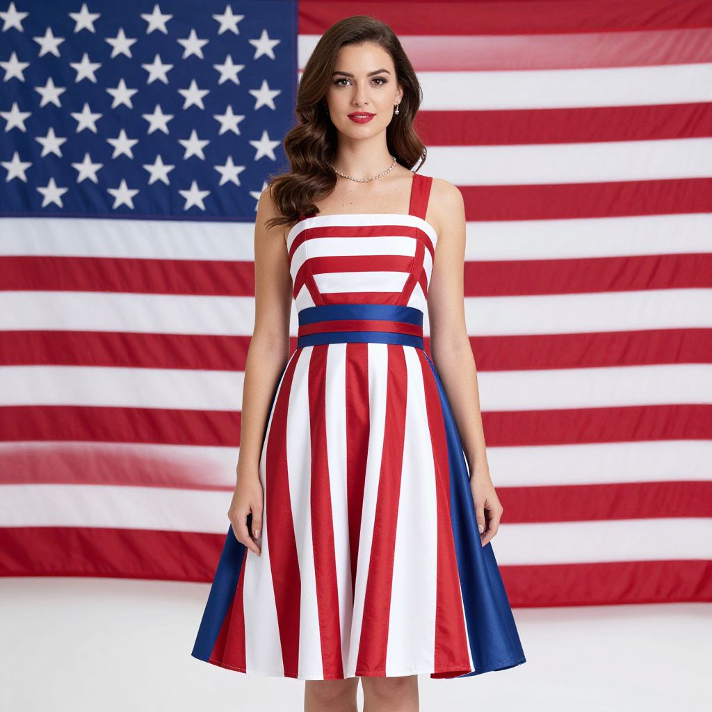 American Flag Formal Dress, image of a woman in a patriotic dress in front of a flag