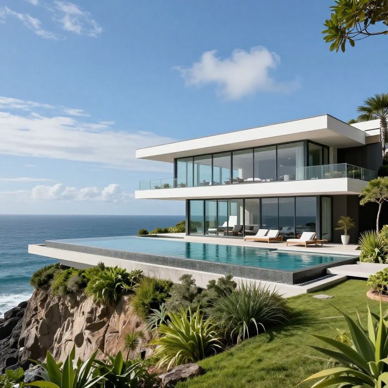 Photograph of a modern, two-story white house with large floor-to-ceiling glass windows, perched on a cliff overlooking a blue ocean. The house features a spacious, rectangular pool with clear water, bordered by a white deck. Two white lounge chairs are positioned near the pool. The foreground includes green grass, various shrubs, and palm trees. The sky is bright blue with scattered white clouds. The cliffside below is rugged with dark rocks and sparse vegetation. The overall scene is bright, sunny, and serene, highlighting the luxurious, coastal architecture.
