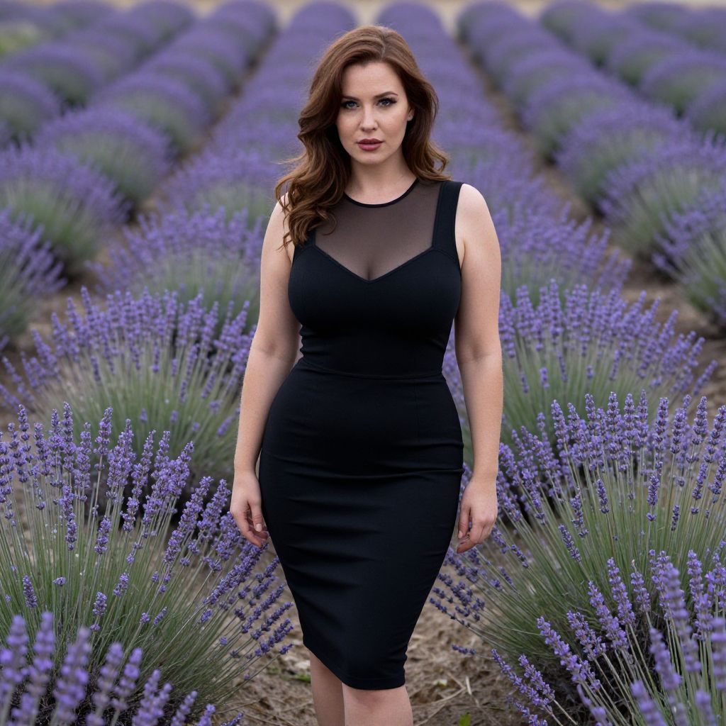 A curvy woman in a sleeveless black dress with mesh details stands gracefully in a lavender field, embodying the haunting visual style of Gottfried Helnwein. The knee-length, form-fitting silhouette contrasts beautifully with the vibrant purple blooms surrounding her. Sexy. Pretty face and beаutiful eyes. Big breasts.