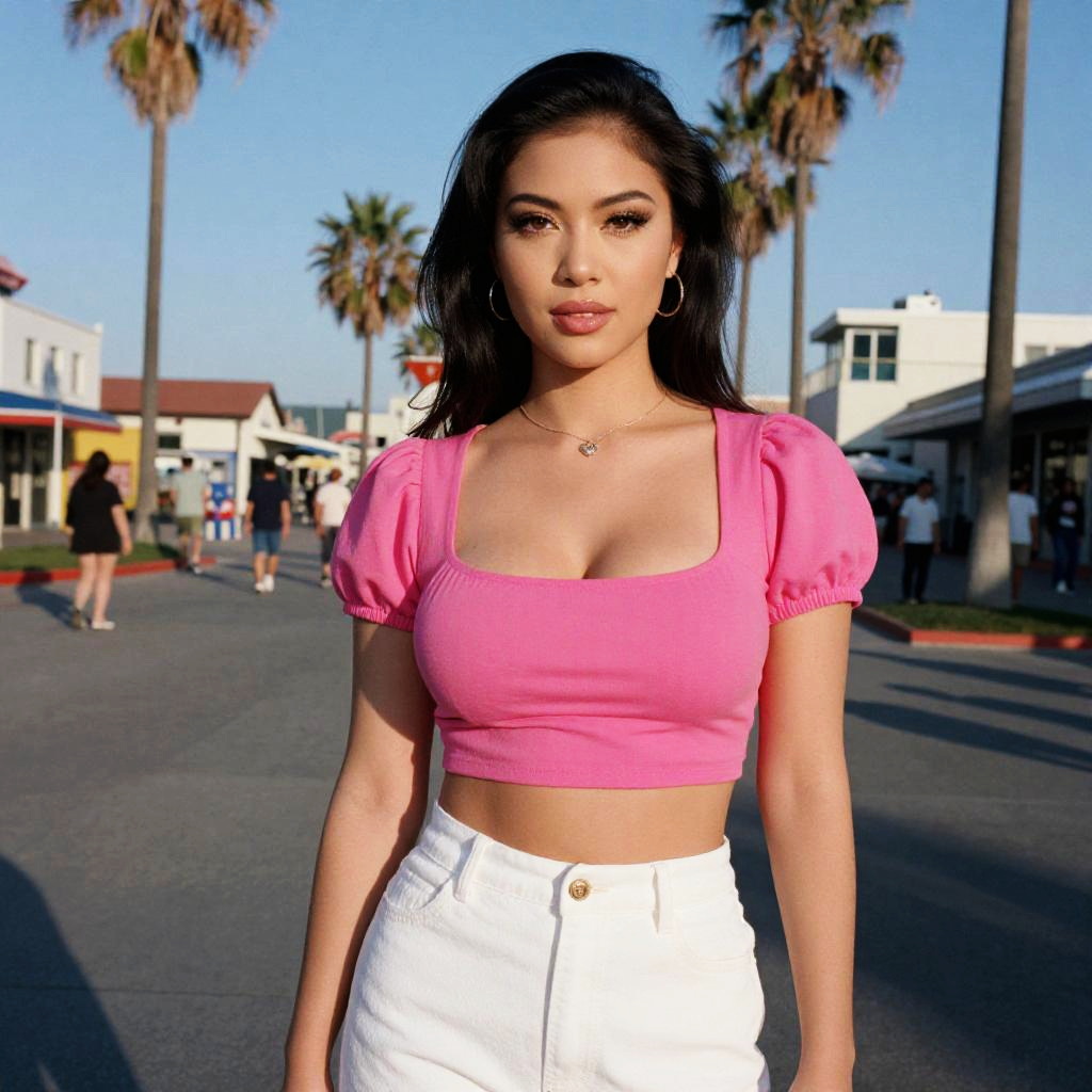 A woman in a trendy hot pink crop top and white high-waisted pants, standing at a fashionable boardwalk in Huntington Beach, captured in the vibrant style of ektachrome film stock. Sexy. Pretty face and beаutiful eyes. Big breasts