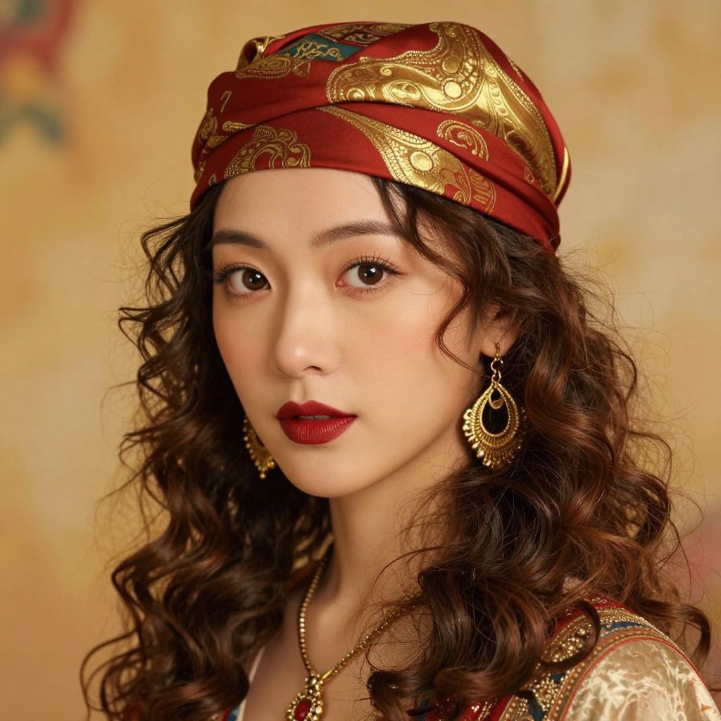 Photograph of an East Asian woman with long black hair, wearing intricate, ornate jewelry. She has a gold headpiece with peacock feather designs and blue and red gemstones, and matching large circular earrings with similar gemstones. Her skin is fair, and she has minimal makeup with dark red lipstick. She wears a black necklace with gold and bead details. The background is a plain, light gray, making her and her jewelry stand out prominently. The style is reminiscent of bohemian or gypsy fashion with a modern, high-fashion twist. Her expression is calm and composed.