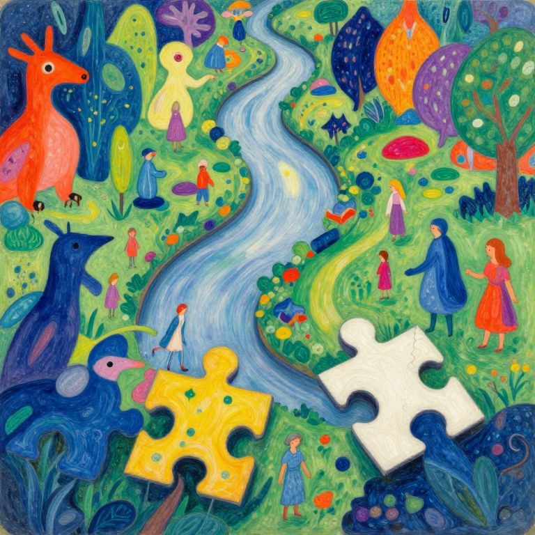 Picture an image imbued with the whimsical essence of Chagall's dreamscapes, revealing a surreal panorama from a bird's-eye vantage point. A tranquil river meanders through a kaleidoscopic landscape where fantastical creatures and humans lead their lives. Below lies a terrain strewn with oversized, intricately crafted jigsaw pieces that engage with the inhabitants in unpredictable ways, lifting them into the air or morphing their forms playfully. This enchanting viewpoint underscores the mystical fusion between nature, humanity, and the enigmatic properties of these interlocking fragments, stirring feelings of awe, intrigue, and delight as the scene unfurls above.