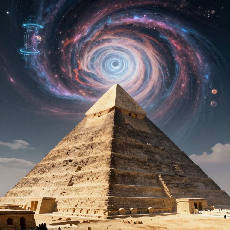 Photograph-like CGI image of an ancient Egyptian pyramid with a weathered, sandy texture, prominently centered against a cosmic background. A vibrant, swirling galaxy with a bright, white core dominates the sky above the pyramid. To the left, blue, glowing UFO-like structures float. Small planets appear to the right. The pyramid is surrounded by a barren, sandy landscape with minimal structures. The lighting contrasts the pyramid's aged stone against the vivid, colorful galaxy. The overall composition blends ancient and futuristic elements.