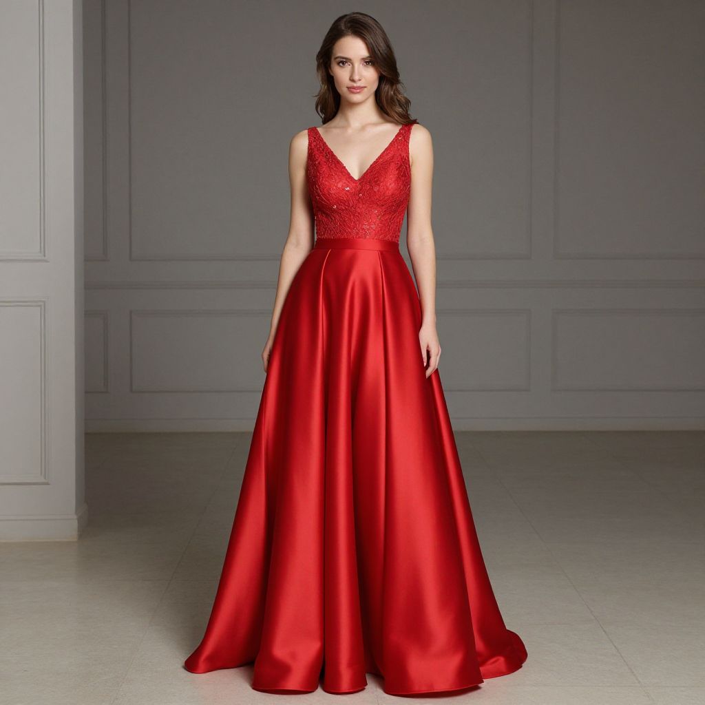 Sexy Spaghetti V Neck Prom Dresses Custom Red Satin Skirt Evening Gowns With Pockets Sweep Train Lace Up Woman Formal Prom Gowns