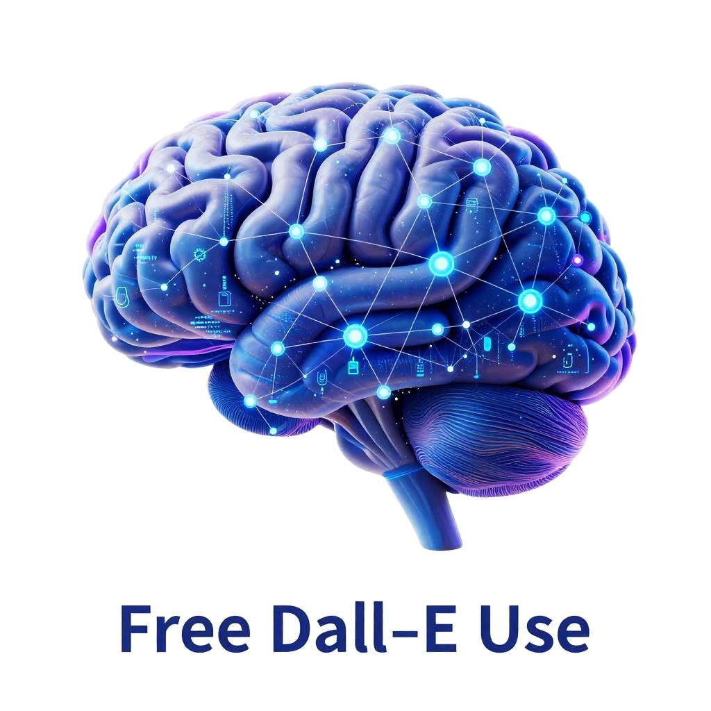 Conceptual visualization of free Dall-E usage, abstract AI brain connected to a global network, flowing streams of creative ideas in vivid blues and purples, glowing data nodes, futuristic and ethereal design representing unlimited artistic freedom