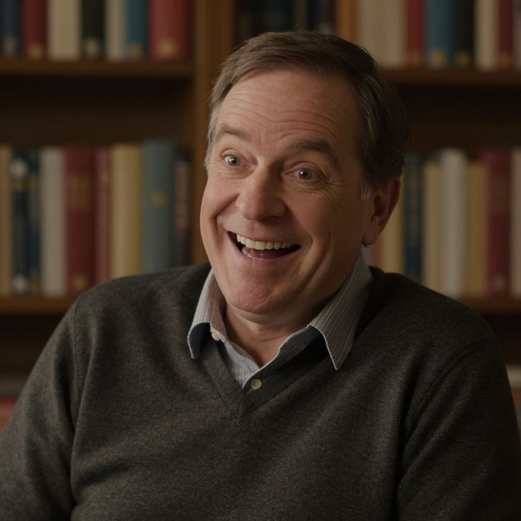Amused expression of a middle-aged man with slight wrinkles, sitting in a cozy library filled with books, warm ambient light, detailed facial features showing genuine laughter and delight, cinematic photography style