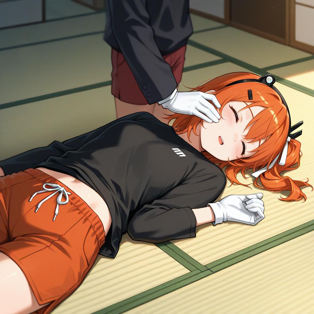 Cowboy shot, adachi_rei, lying on tatami mat, indoors, sleeping, closed eyes, hand on another's cheek, twin drills, orange hair, red hair, blush, parted lips, mouth drool, cheek squash, shadow play, black shirt, white gloves, red shorts, subtle danger, warm hearthside glow, slightly glossy underline, finely ribbed textile