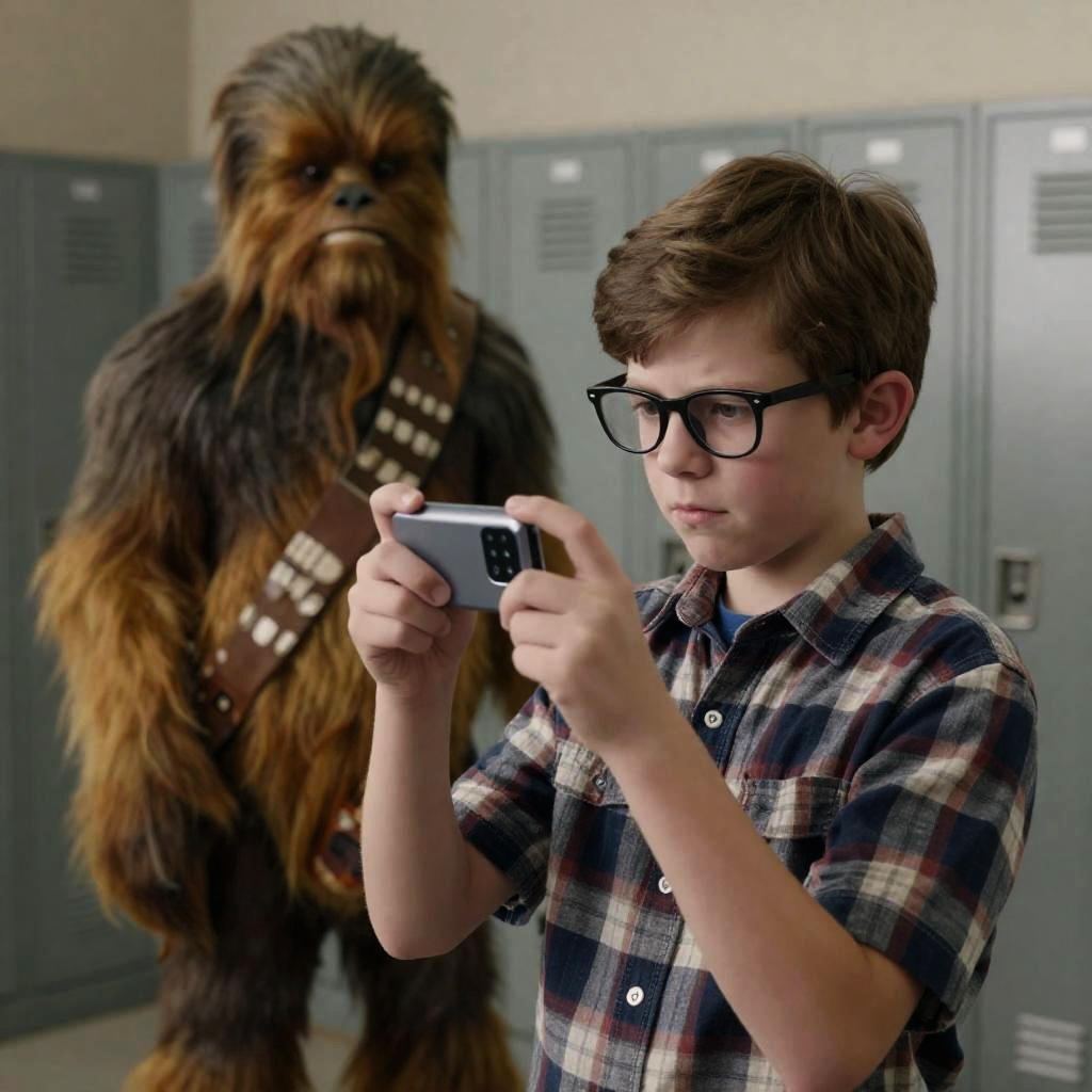 Photograph of a young boy with brown hair, glasses, and a plaid shirt holding a small device close to his face. A Wookiee stands in the background near lockers, looking angry. Boy focused on device, Wookiee in mid-yell. Indoor setting.