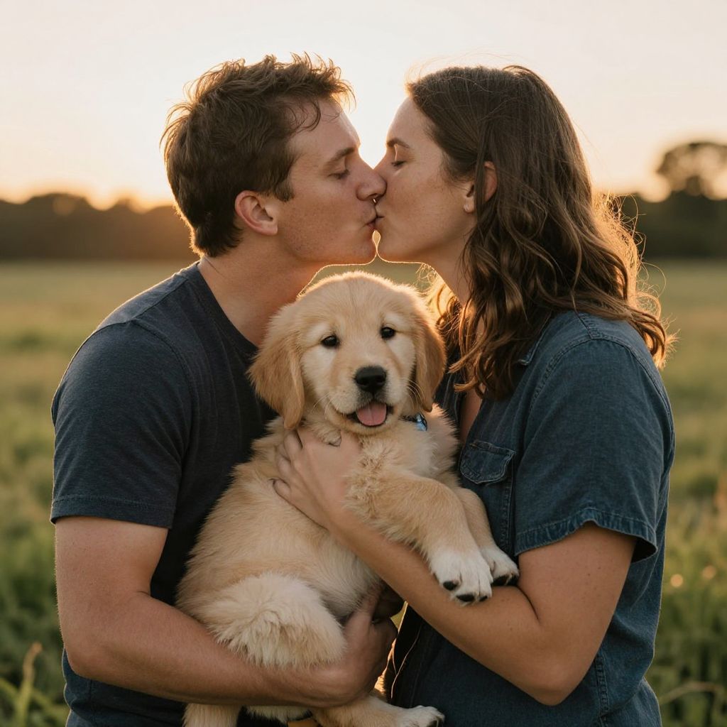 Man and woman share a tender kiss while cradling their joyful golden retriever puppy in their arms during a serene sunset engagement photography session.