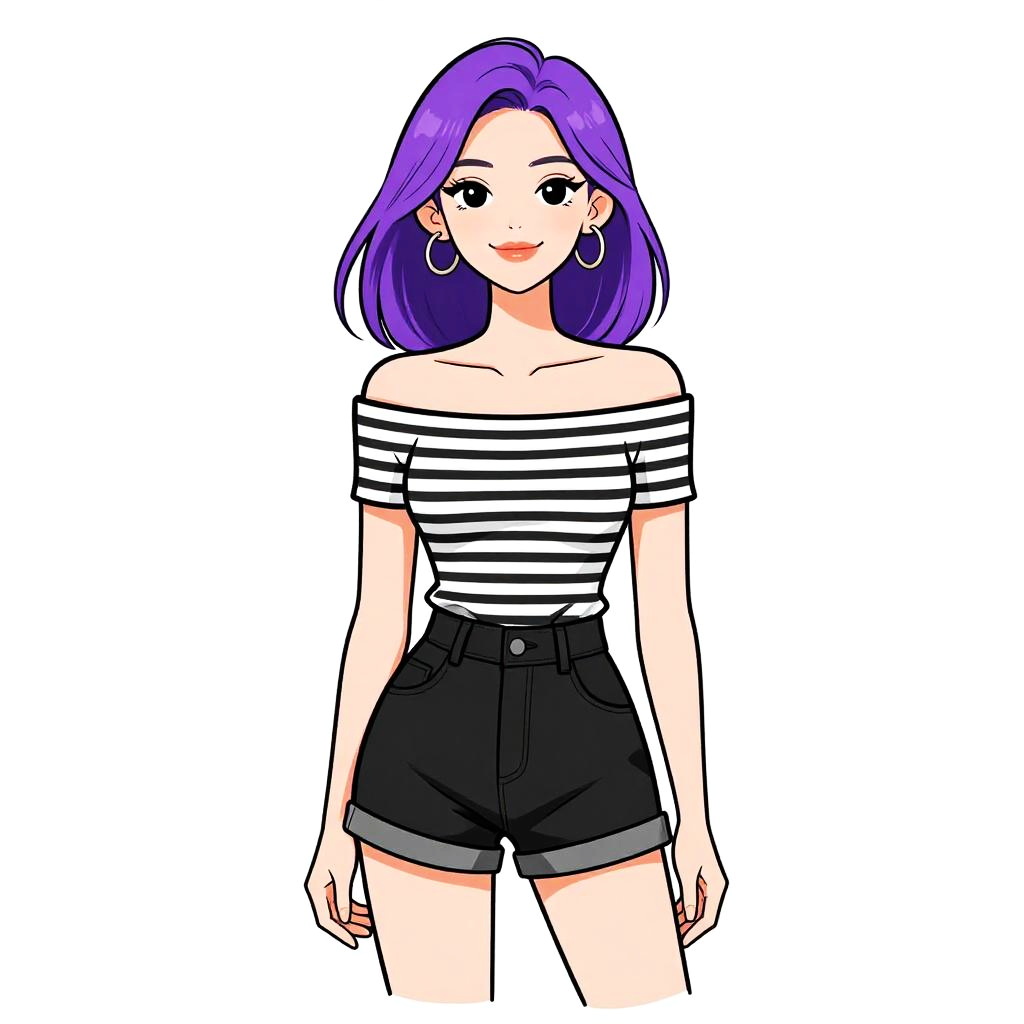 Digital anime-style drawing of a smiling woman with long purple hair, wearing a black-and-white checkered short-sleeve romper. White background.