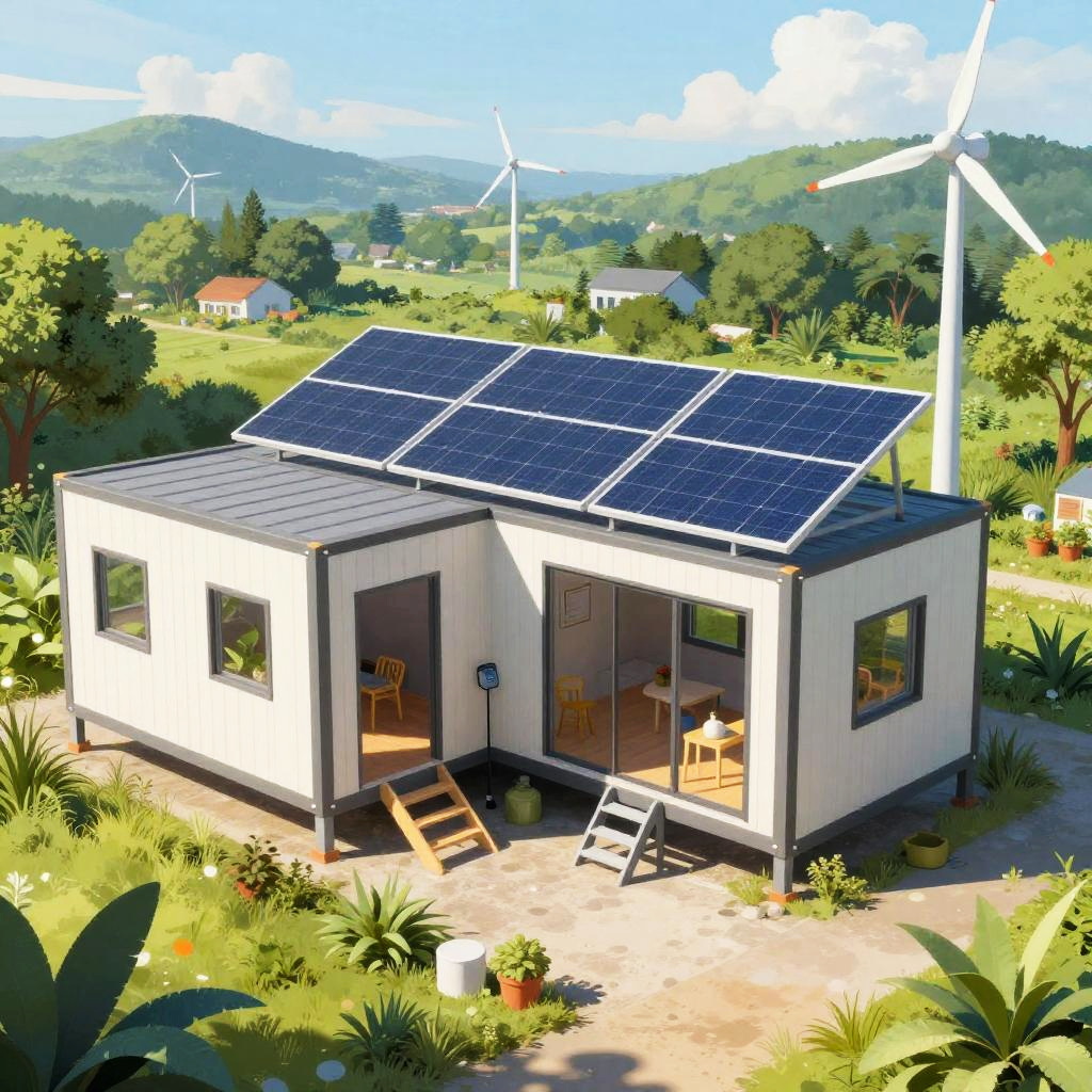 Building generator powered by renewable energy, eco-friendly futuristic workshop producing sustainable modular homes, solar panels and wind turbines visible, lush greenery surrounding, bright and optimistic atmosphere, highly detailed and vibrant digital painting