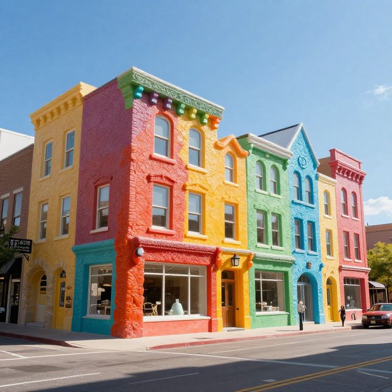 Photograph of a row of brightly colored, three-story buildings on a sunny street corner, featuring vivid red, yellow, green, blue, and orange