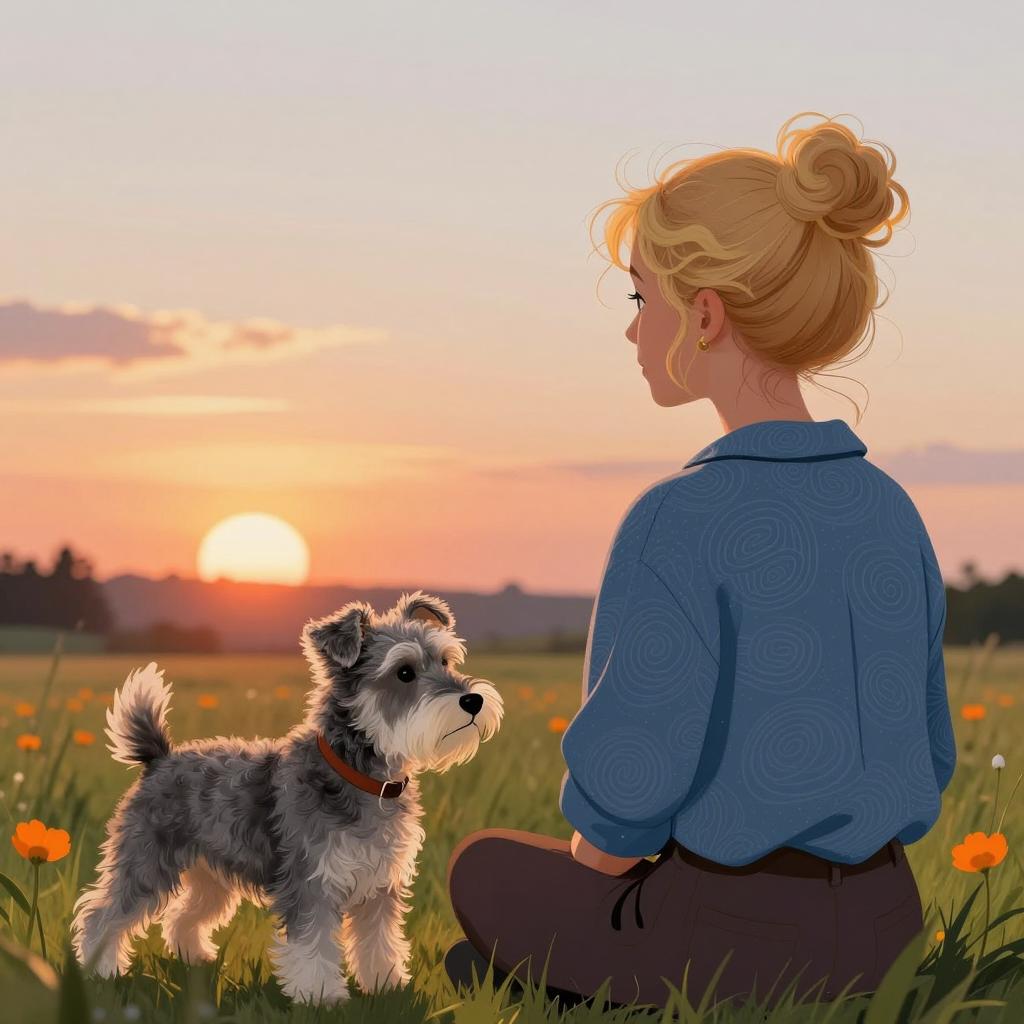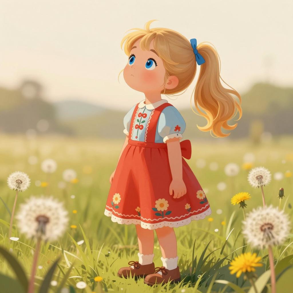 Illustration of a baby girl with large blue eyes, wearing a red bow in her messy blonde hair, resting her head on her hands. She wears a sleeveless top, blue jeans, and a pearl bracelet. A small white dog sits to her left. Pink flowers and tall grass surround her. She looks sad. The background is blurred with soft colors.