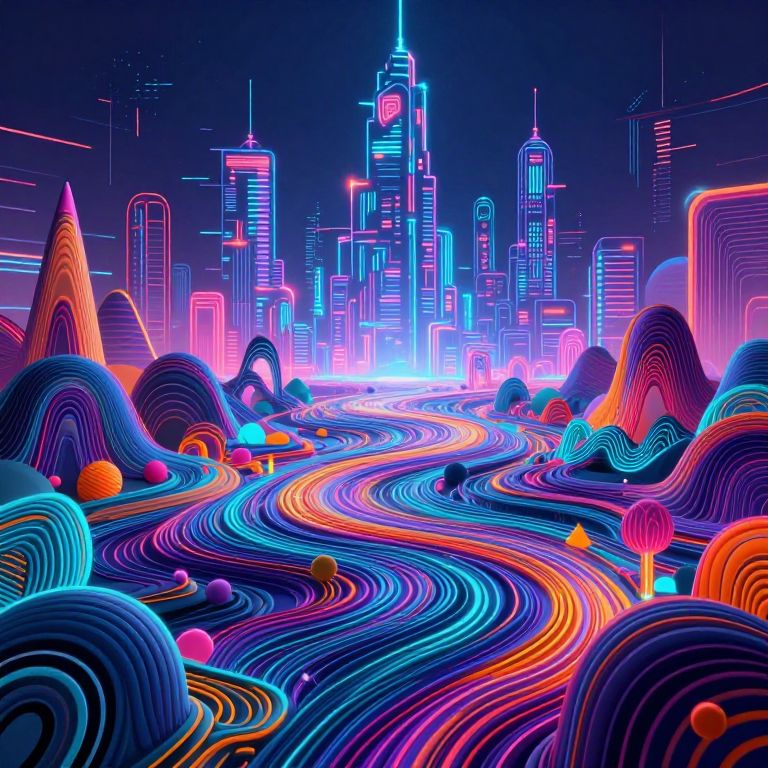 Vqgan art, a futuristic neural network generating surreal landscapes with vibrant colors and intricate geometric patterns, glowing cyberpunk cityscape in the background, digital glitch effects, high detail, 4k resolution, immersive abstract vibes