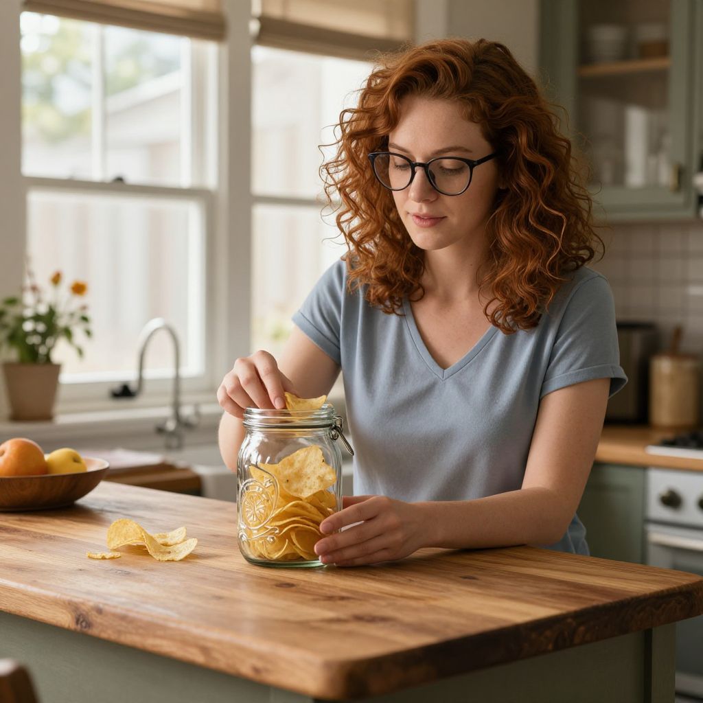 A detailed food photography shot of white chips being freshly fried in a rustic kitchen in a small Mediterranean village, with the chips golden on the edges and white in the center, viewed from an angle showing the oil-stained wooden countertop, a woman with curly black hair and a serious yet kind face placing a plate of chips in front of a young girl with bright green eyes.