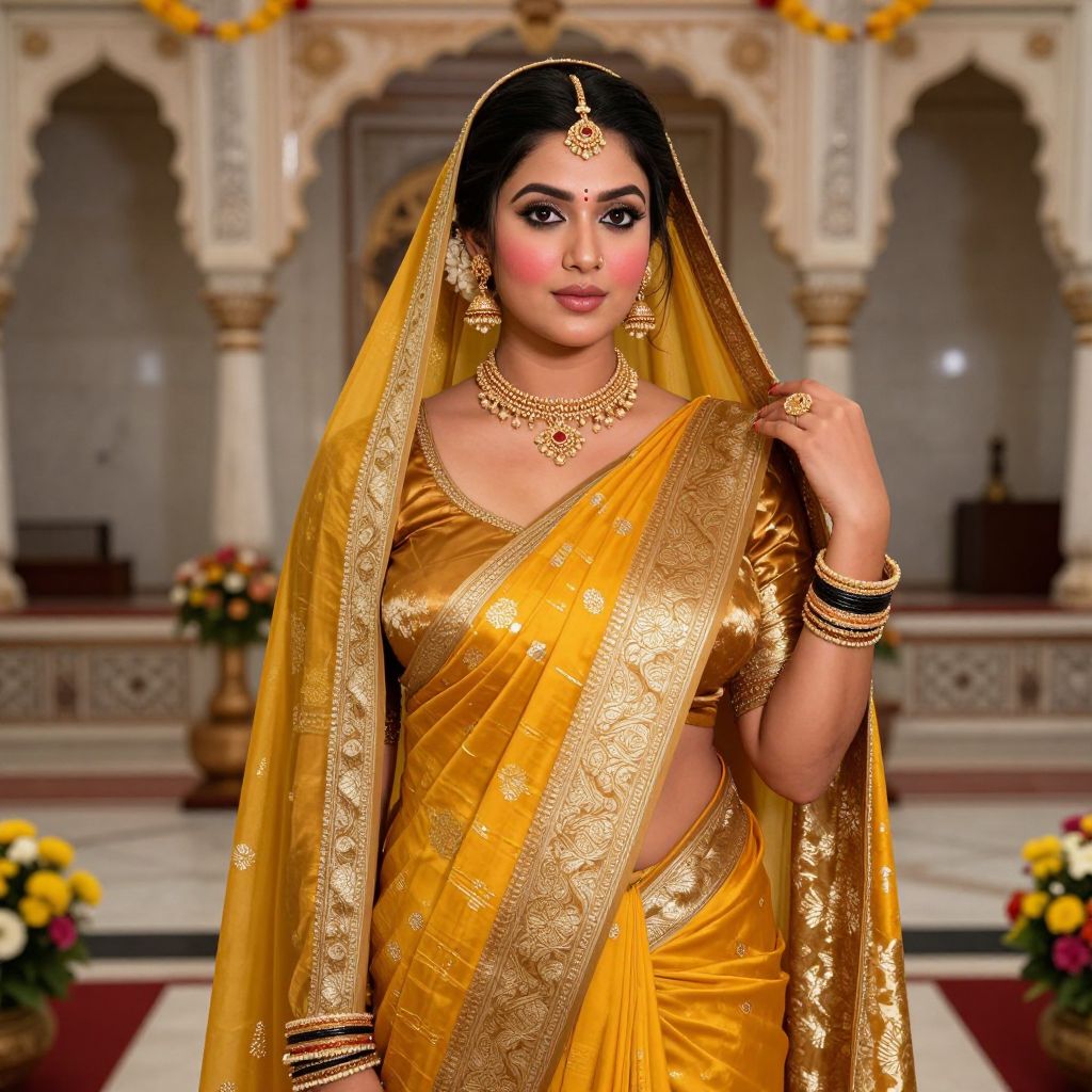 Photograph of an Indian bride in a golden saree with intricate patterns, wearing traditional jewelry, standing in a decorated temple.