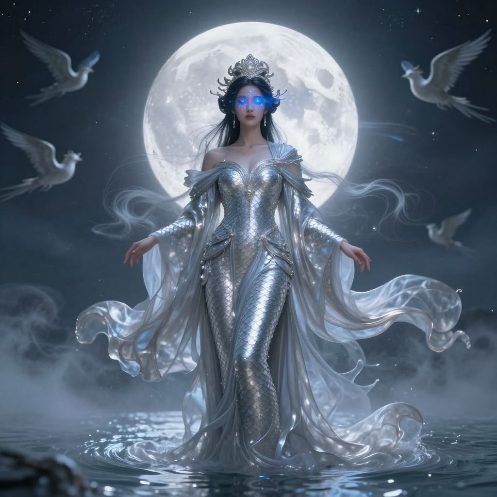 Mythical moon goddess fantasy art, a divine figure rising from celestial waters under a giant full moon, silver scales blending with flowing robes, eyes shining with cosmic wisdom, ethereal mist swirling around, celestial creatures flying in background, immersive magical realism