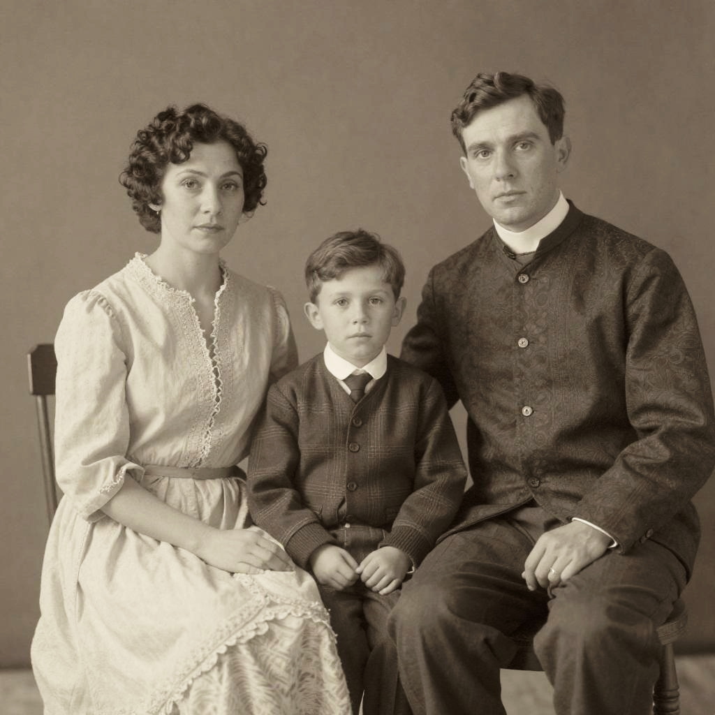 Old photo restoration of a black and white family portrait, capturing intricate details of vintage clothing and subtle textures, enhanced with soft lighting and a gentle sepia tone to evoke nostalgia and timelessness.