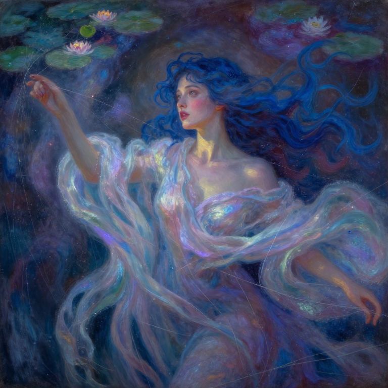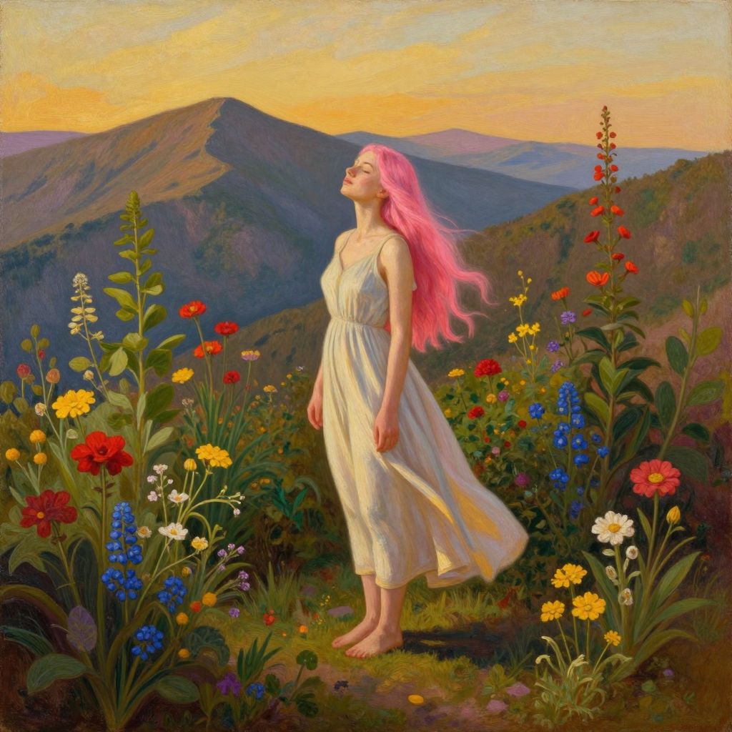 An enigmatic female figure stands upon an island of vibrant flora, her silhouette casting a captivating shadow on the verdant landscape below. This surreal scene combines the fantastical elements reminiscent of Salvador Dali's works with the dreamy pastel tones evocative of Hermes Monet's impressionist landscapes. Sunlight filters through the clouds, dappling the figure in soft, diffused light that accentuates her intricate, iridescent attire made of translucent materials, reflecting the colors of the sky and plants surrounding her. The unique perspective, situated between eye level and aerial view, immerses viewers within this enchanting fusion of fantasy, grace, and natural beauty, invoking a sense of wonder and serenity.
