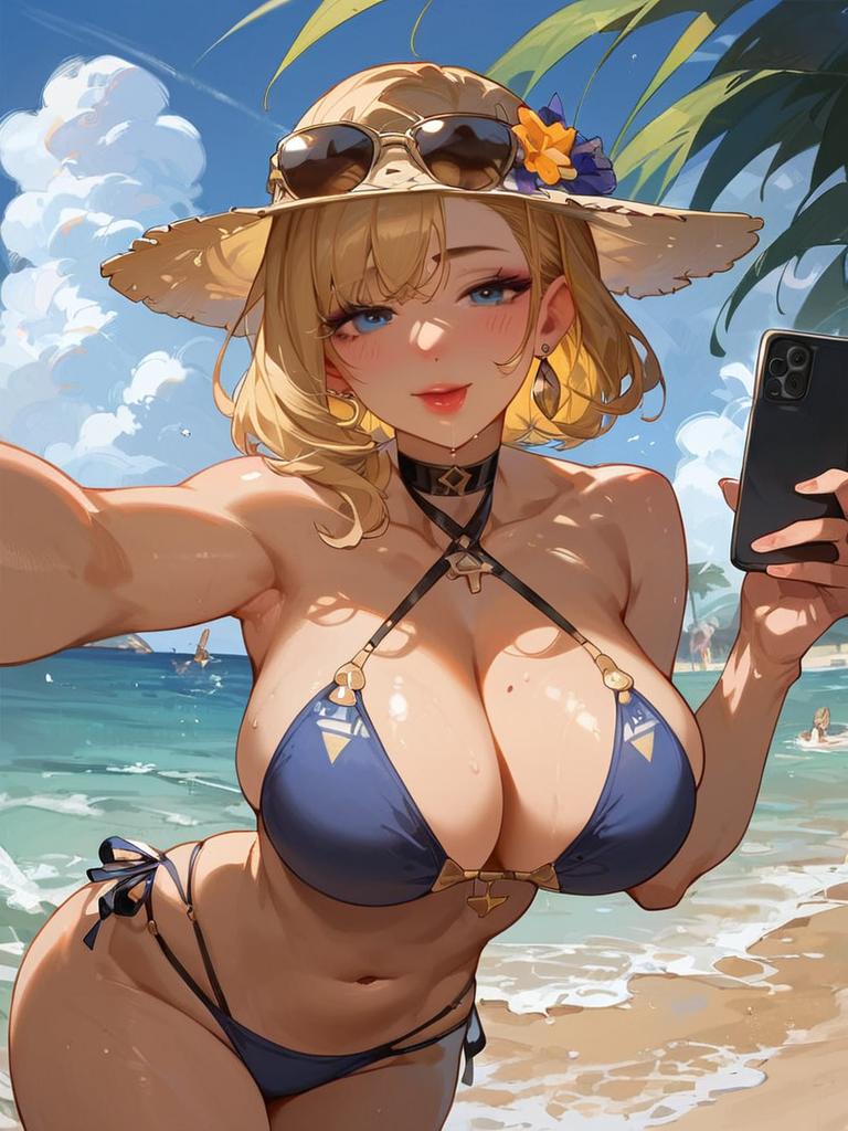 1girl, huge breasts, cleavage, wearing printed triangle string bikini top and low-rise bikini bottoms in graphic red and white surf-inspired bikini set on medium-toned woman with wavy hair and glossy lips posed smiling subtly toward the lens with shoulders angled in campground area with ATV and parked vehicles under bright direct daylight with strong highlights, fun summer snapshot-style beachwear photography, high resolution, ultra-detailed