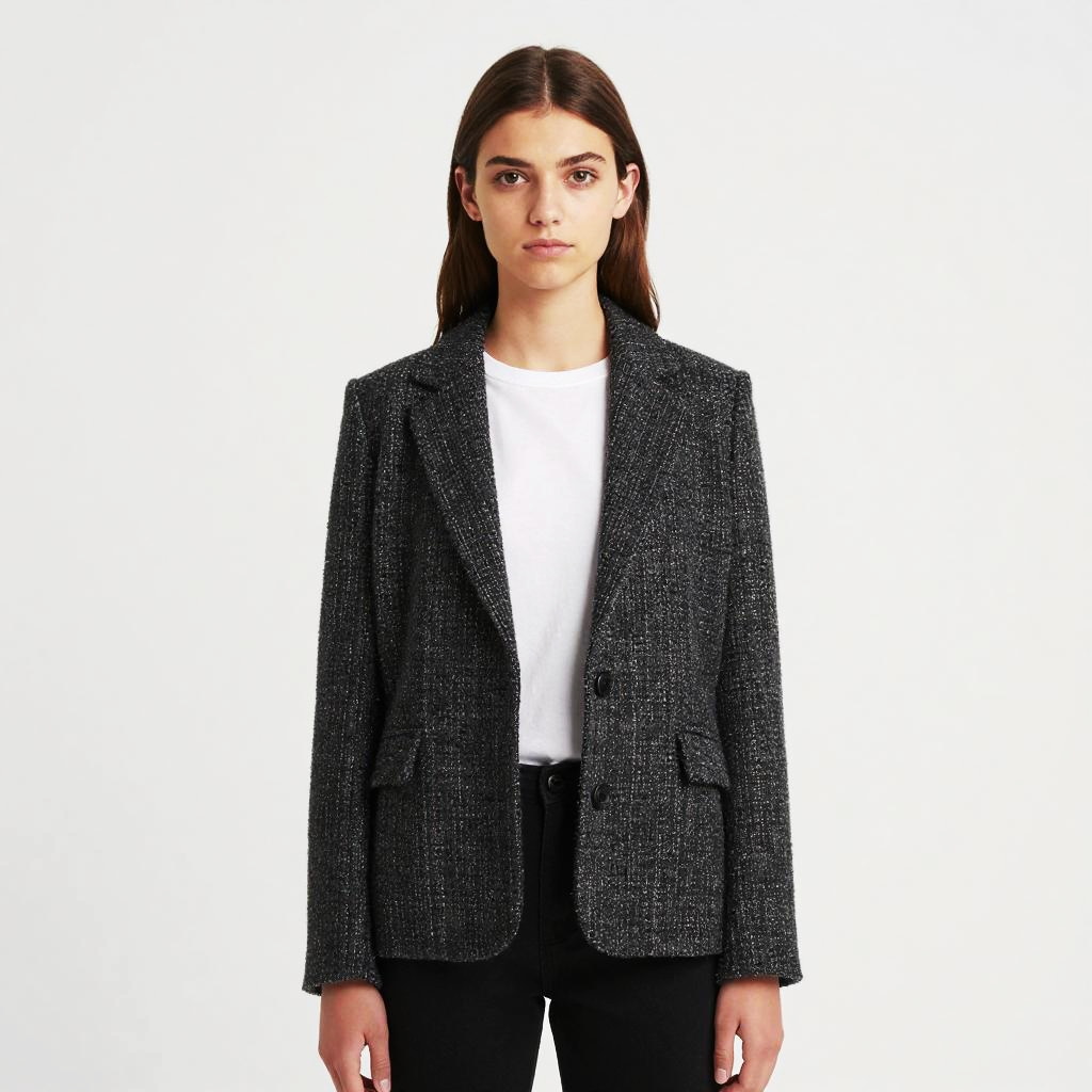 Photograph of a young woman with light skin and straight, dark brown hair parted in the middle. She has a neutral expression and wears a black, textured blazer over a plain white t-shirt, paired with black pants. The background is entirely white, making her the focal point. She stands straight, facing the camera, with her arms relaxed at her sides. The blazer has a slightly fitted cut and the texture appears slightly rough, adding a subtle contrast to the smoothness of her t-shirt. The overall style is minimalist and professional.