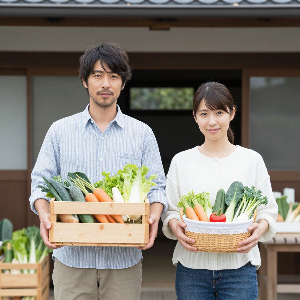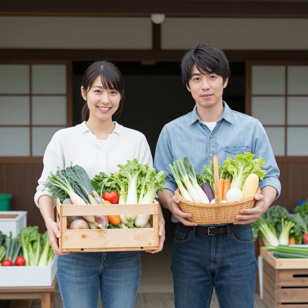 Photograph of an Asian couple standing in front of a traditional Japanese wooden building. The woman, with black hair in a ponytail, wears a white long-sleeve shirt and blue jeans, holding a wooden crate filled with fresh vegetables including tomatoes, green onions, and carrots. The man, with black hair, wears a light blue denim shirt and dark jeans, holding a wicker basket with similar vegetables. Both smile at the camera. The background includes various wooden crates with more vegetables and a dark doorway. The image has a bright, colorful, and crisp look.