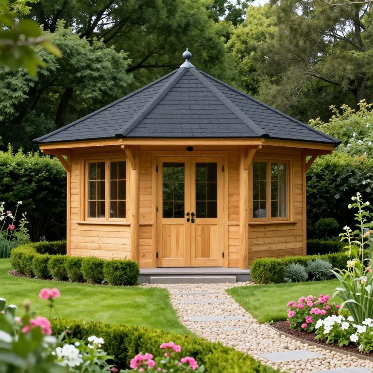 Octagonal summerhouse with a black shingled roof and light wooden exterior stands gracefully in a lush garden, surrounded by vibrant green grass, neatly trimmed hedges, and colorful flowerbeds featuring pink and white blooms, with a pebble pathway leading up to its double doors.