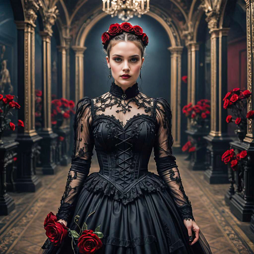 Photo of a Athletic woman, Braided Updo, gothic romance outfit, black Midnight lace dress, Chiffon corset, dark red roses, silver jewelry, Victorian style, chunky heels, dramatic makeup, moody, elegant, mysterious, Opulent ballroom, whimsical darkness