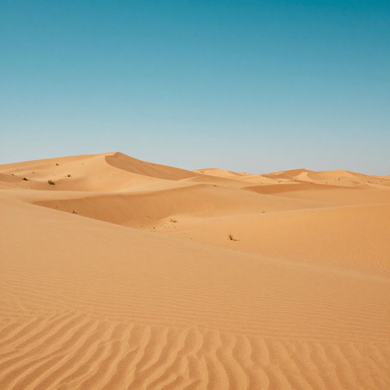 Photograph of a vast, sunlit desert with rippled sand dunes under a clear, bright blue sky. Warm golden-orange sand contrasts with the
