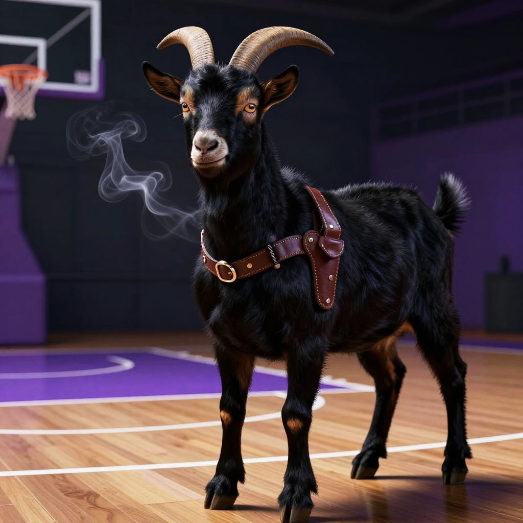 Apple Cinnamon A goat with shadowy smoke wisps, wearing a leather holster, standing on a basketball court. The scene is regal, emphasizing midnight black with purple accents, hyper-detailed, beautifully color-coded, insane details, Unreal Engine, Cinematic Lighting.